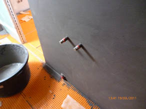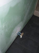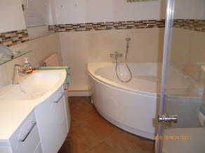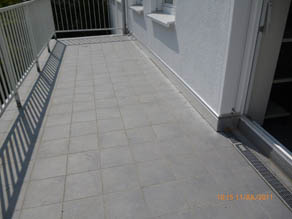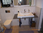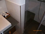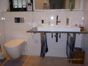 Durchgängig gefliester Wohnbereich - Eingelassener Holzofen mit Wandverkleidung aus Naturstein.
