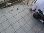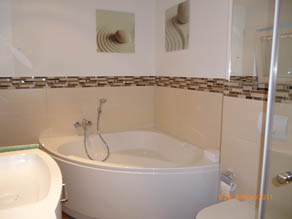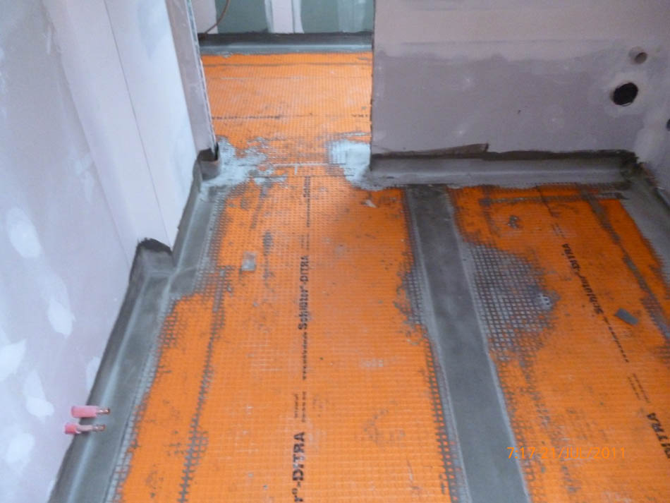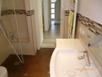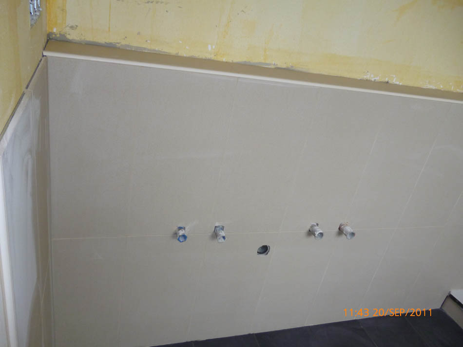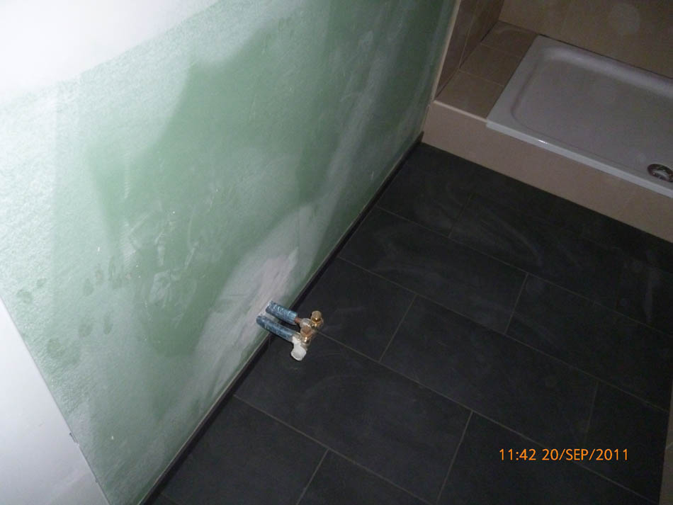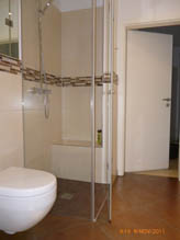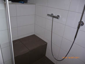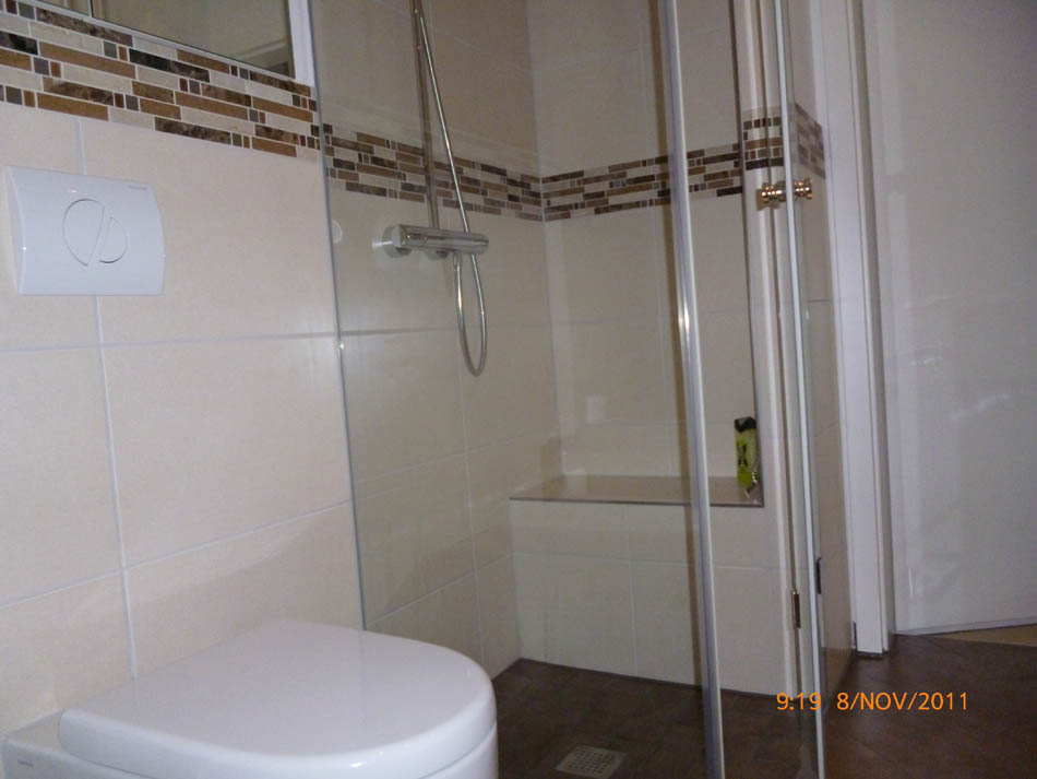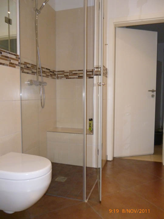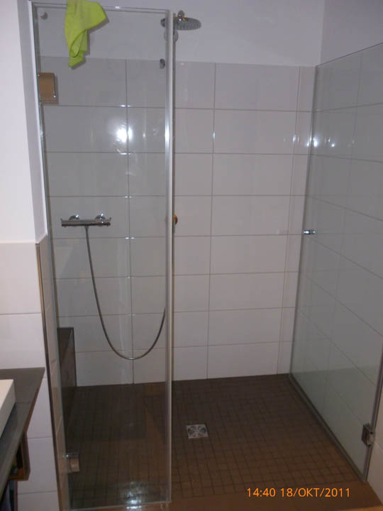 Modernes Badezimmer mit geteilter Duschnische: Weiße Wandfliesen und kontraststarke Bodenkacheln.